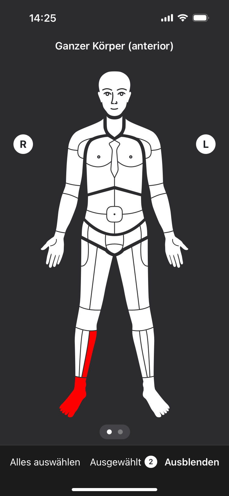 Intuitive Wundlokalisation per Diagramm: wählen Sie eine oder mehrere Körperstellen aus. Nie mehr nach den richtigen Worten suchen. Die Software übersetzt Ihre Auswahl dann in die richtigen medizinischen Fachbegriffe, wie z. B. „Unterschenkel rechts Medial Anterior“ & „rechter Fuss“.