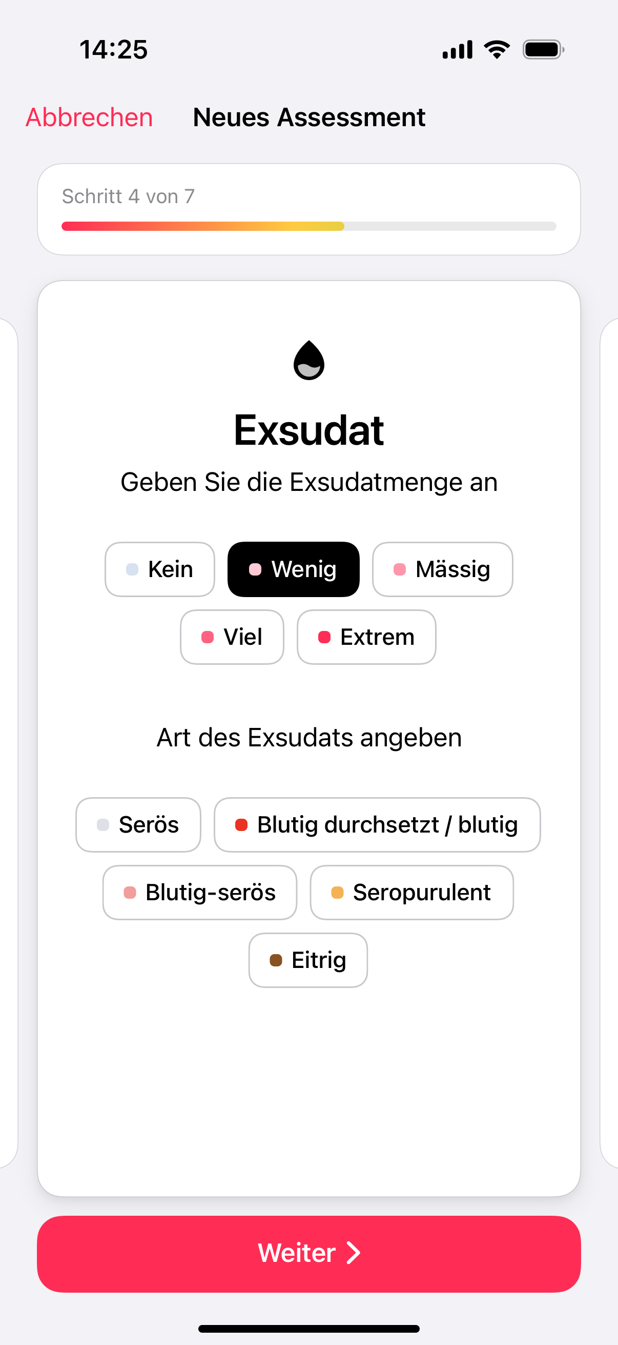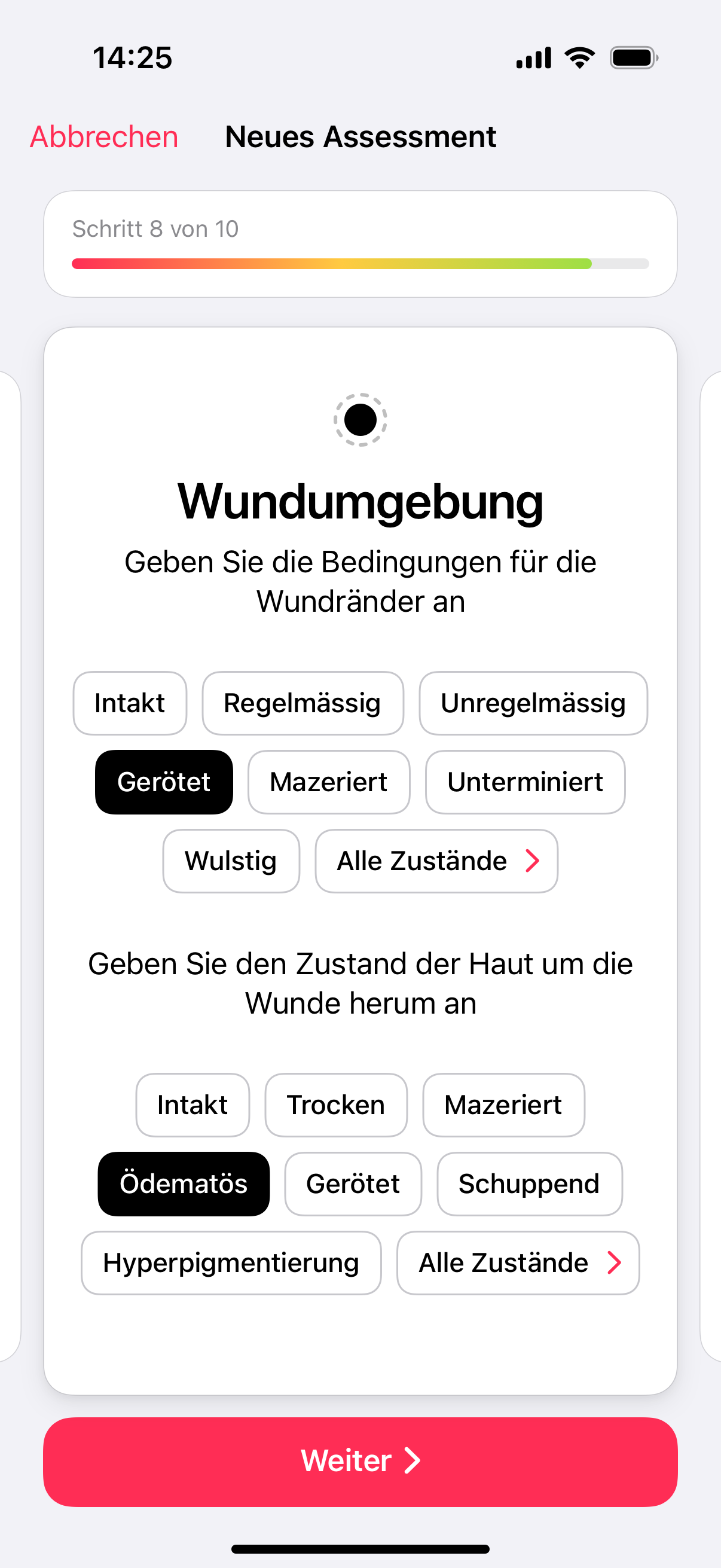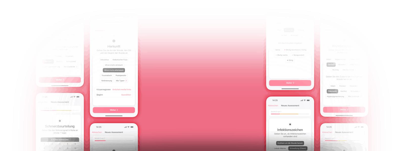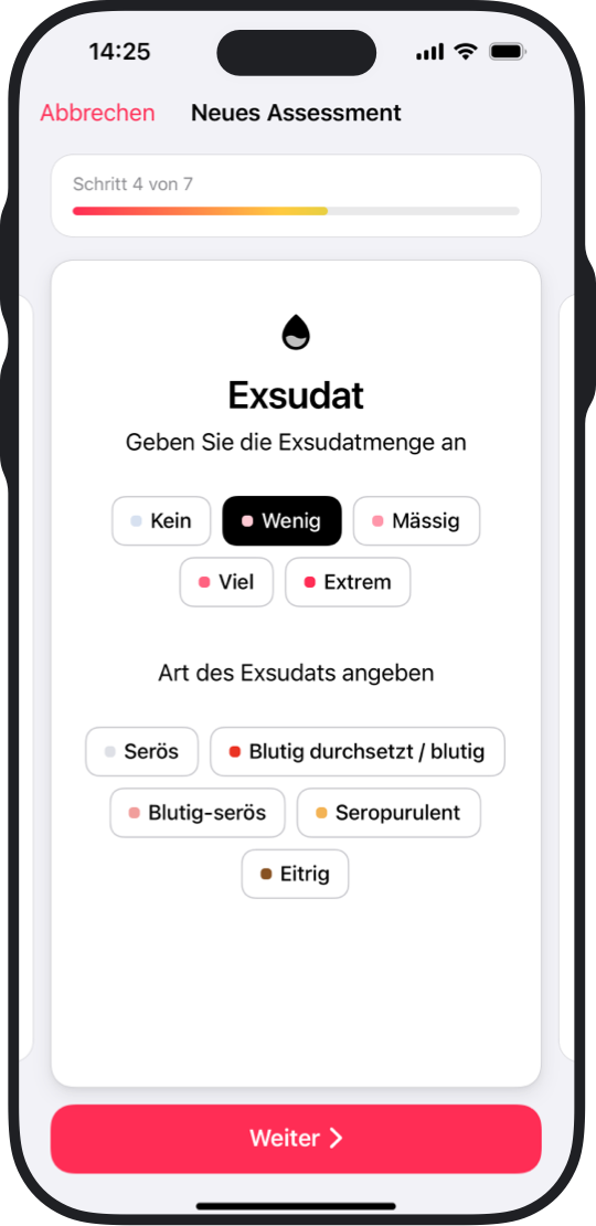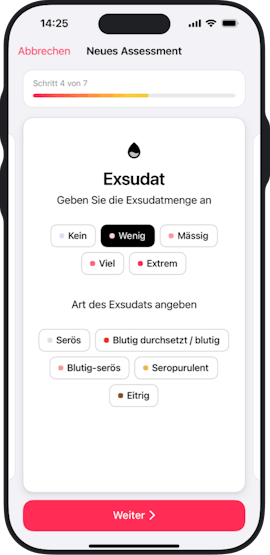 Hören Sie auf zu tippen - wählen Sie einfach aus. Unser intuitiver Workflow ermöglicht es Ihnen, Wunddetails schnell und strukturiert über standardisierte Optionen zu dokumentieren. Zusätzliche Notizen ergänzen Sie nur dann, wenn sie wirklich notwendig sind.