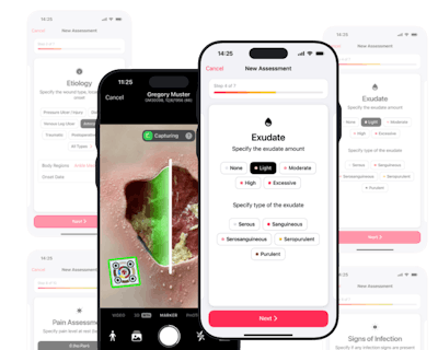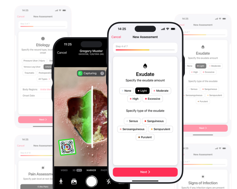 Efficiently document, categorize and precisely measure acute and chronic wounds directly at the point of care (width, length, circumference, area).