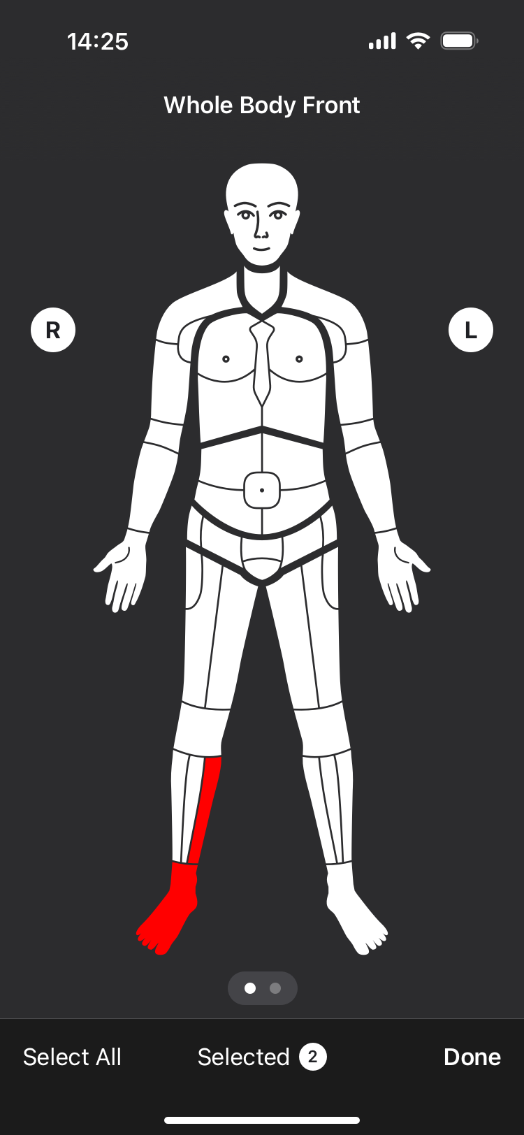 Intuitive wound localisation on a body chart: select one or several body parts. Eliminate the search for the right words. The software translates your visual selection into the correct medical terms, e.g. "right lateral anterior lower leg" & “right foot”.