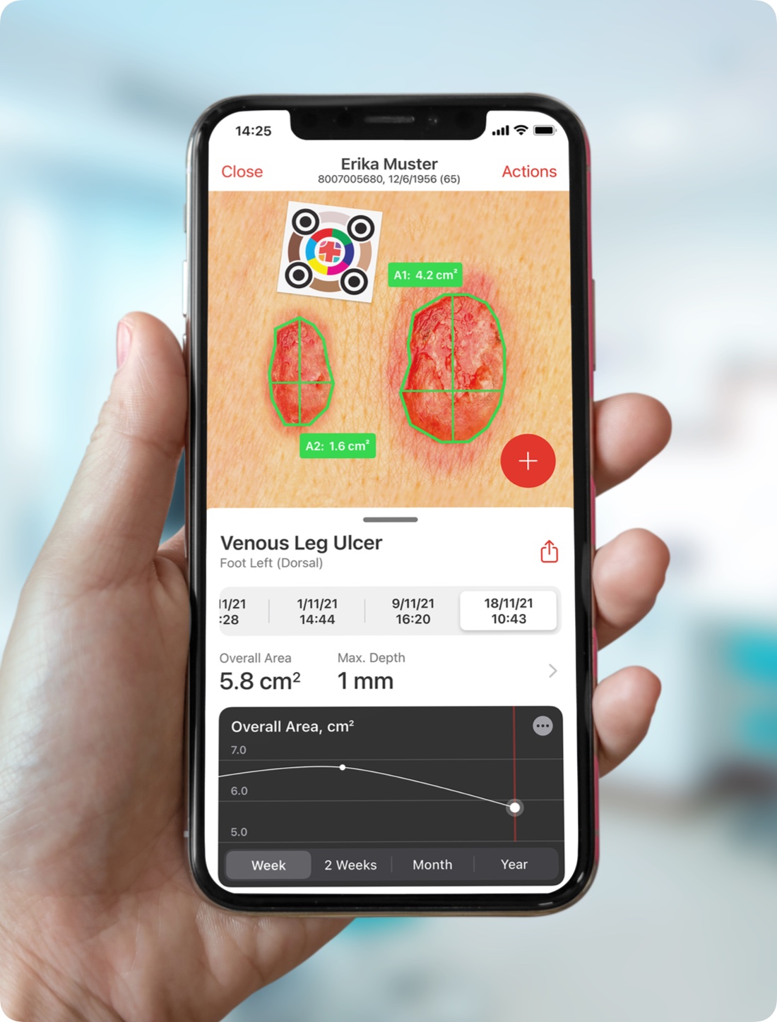 The app recognises the calibration marker as the reference size, and then our software calculates the wound area.