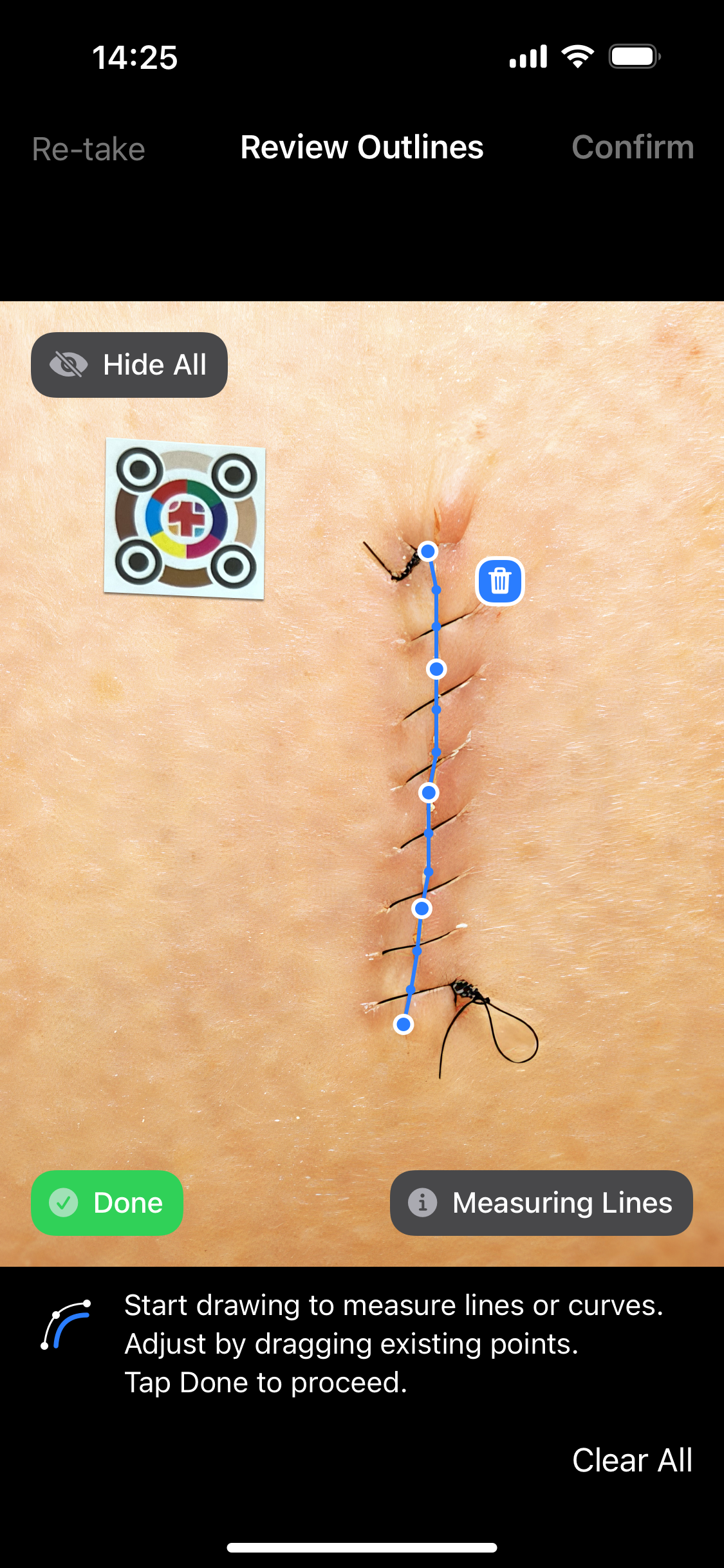 Immédiatement après avoir pris une photo d'une anomalie cutanée ou d'une plaie, imitoCam peut calculer automatiquement sa largeur, sa longueur, sa circonférence et sa surface. La méthode de mesure d'imito est scientifiquement validée.